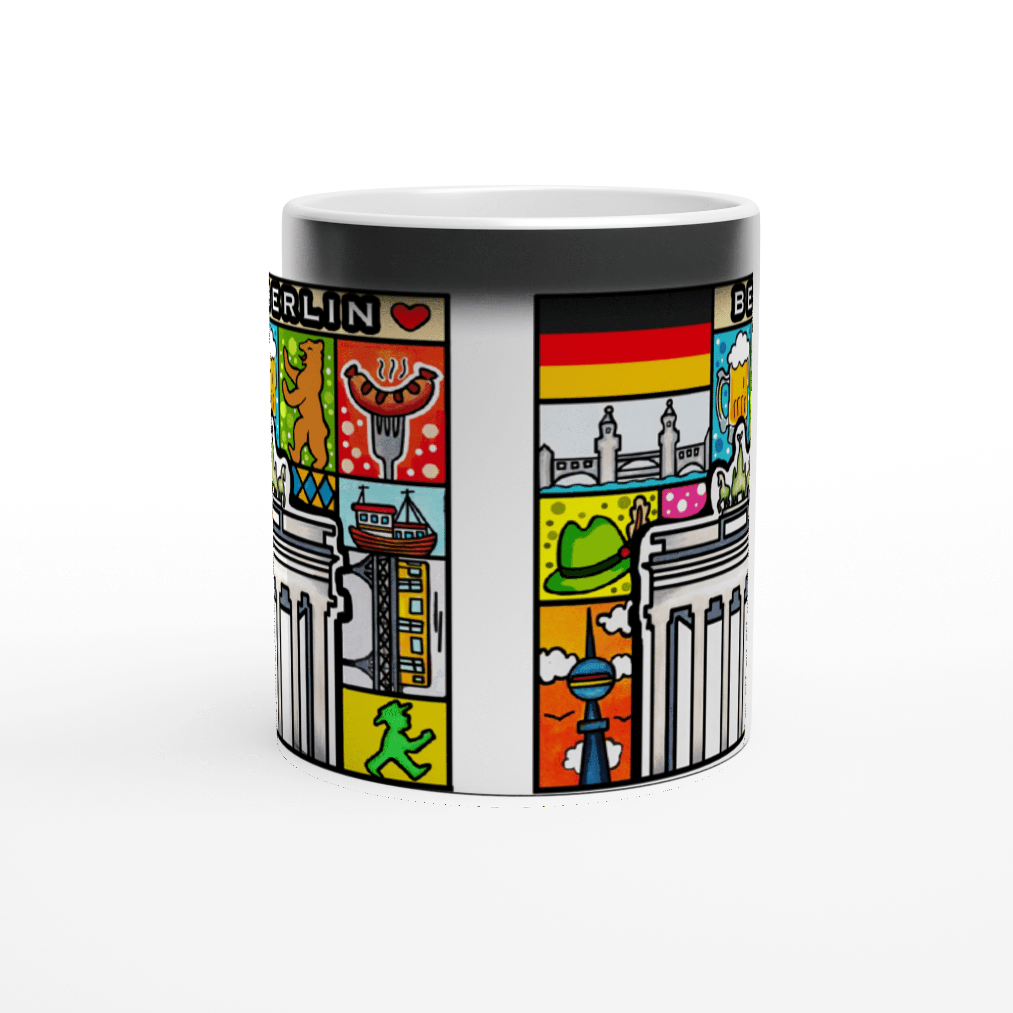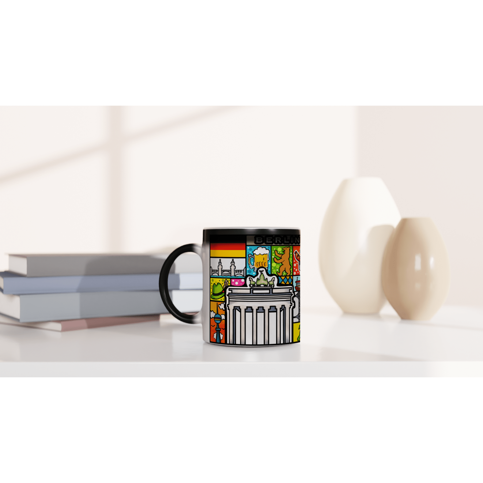 This mug has a black glossy finish when it’s empty. When a hot beverage is added, the mug reveals your beautiful artwork.