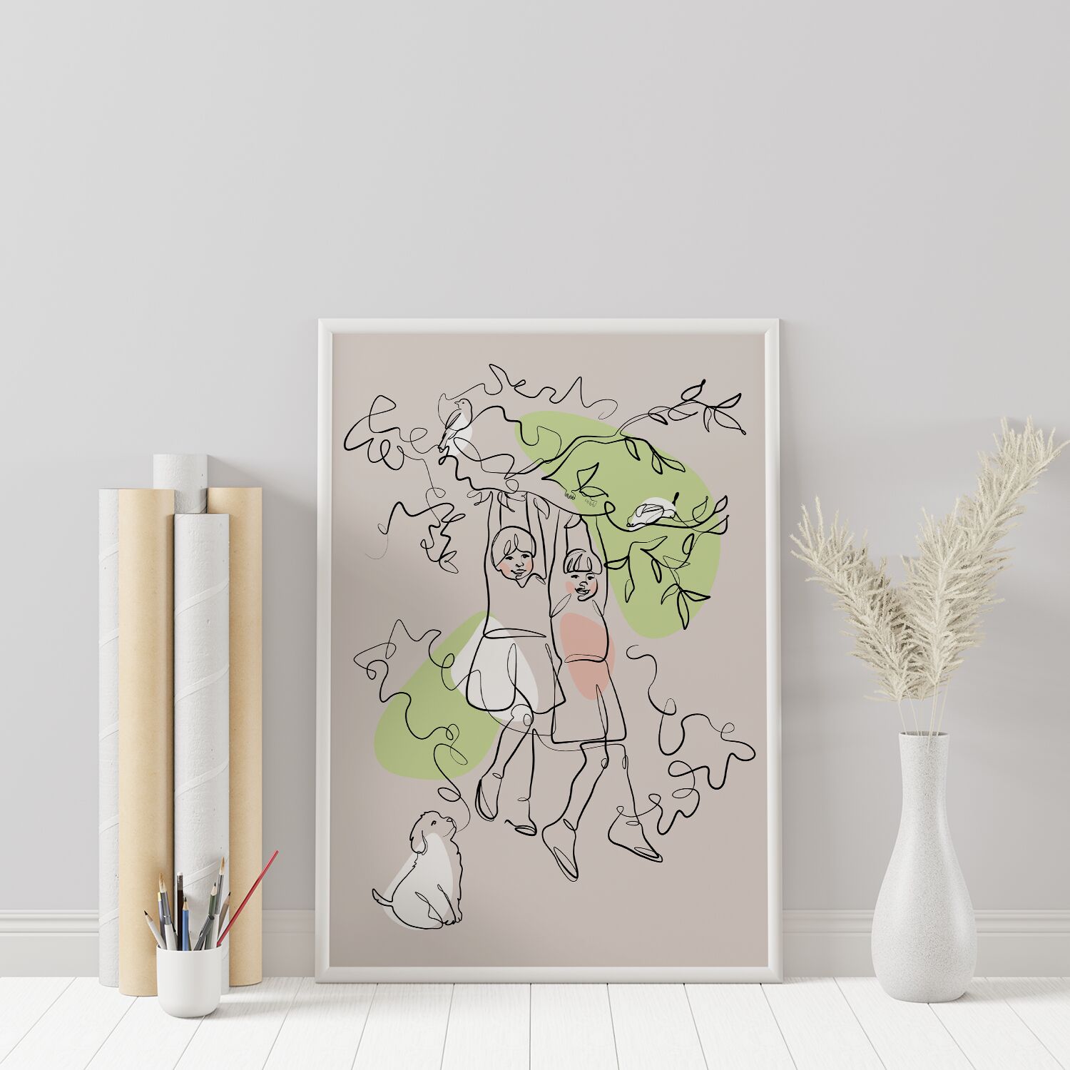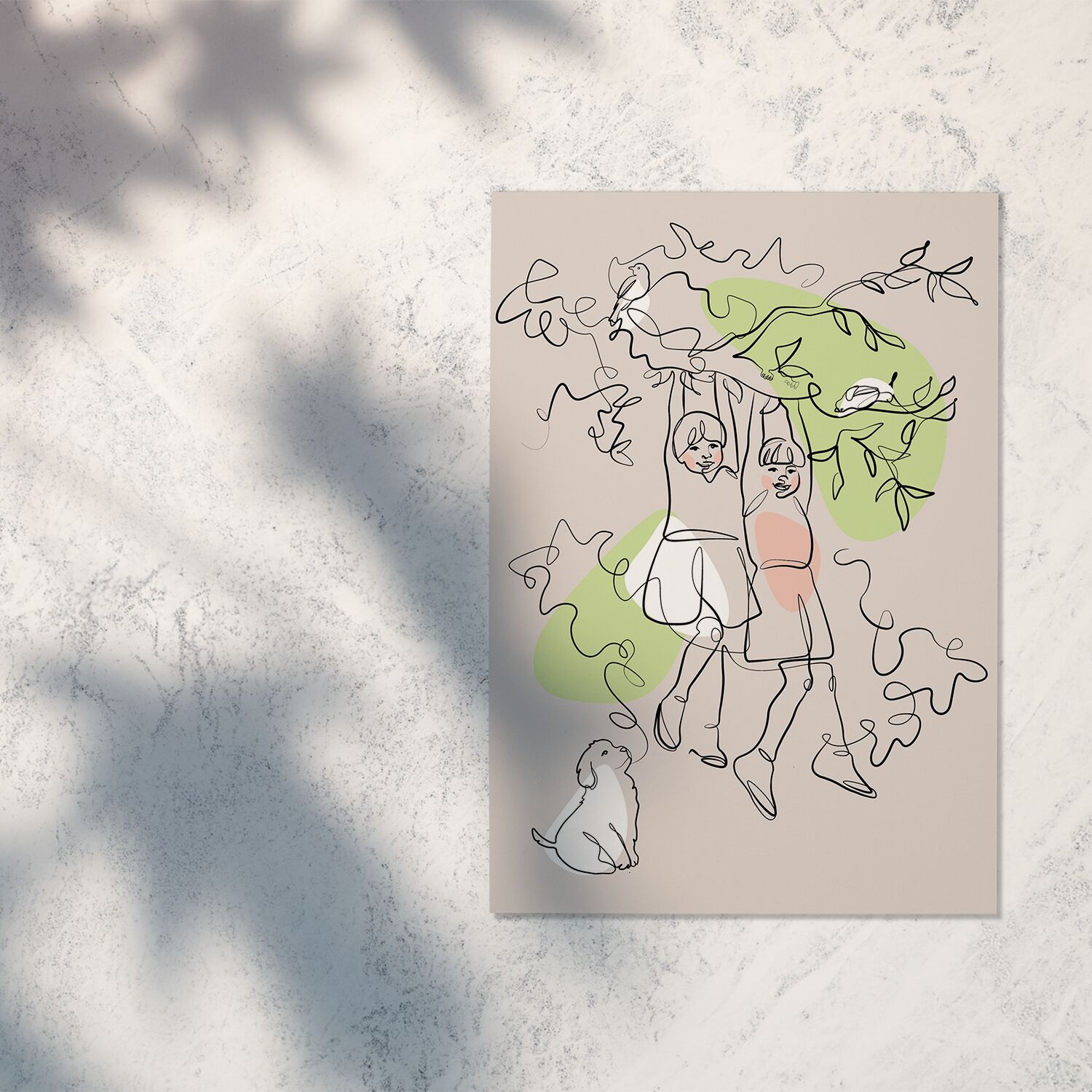 This nursery Wall Decor line art art print of Two Sisters Hanging From a Tree is the perfect addition to your nursery room decor. This eye-catching piece will add a feeling of serenity and balance to your space.