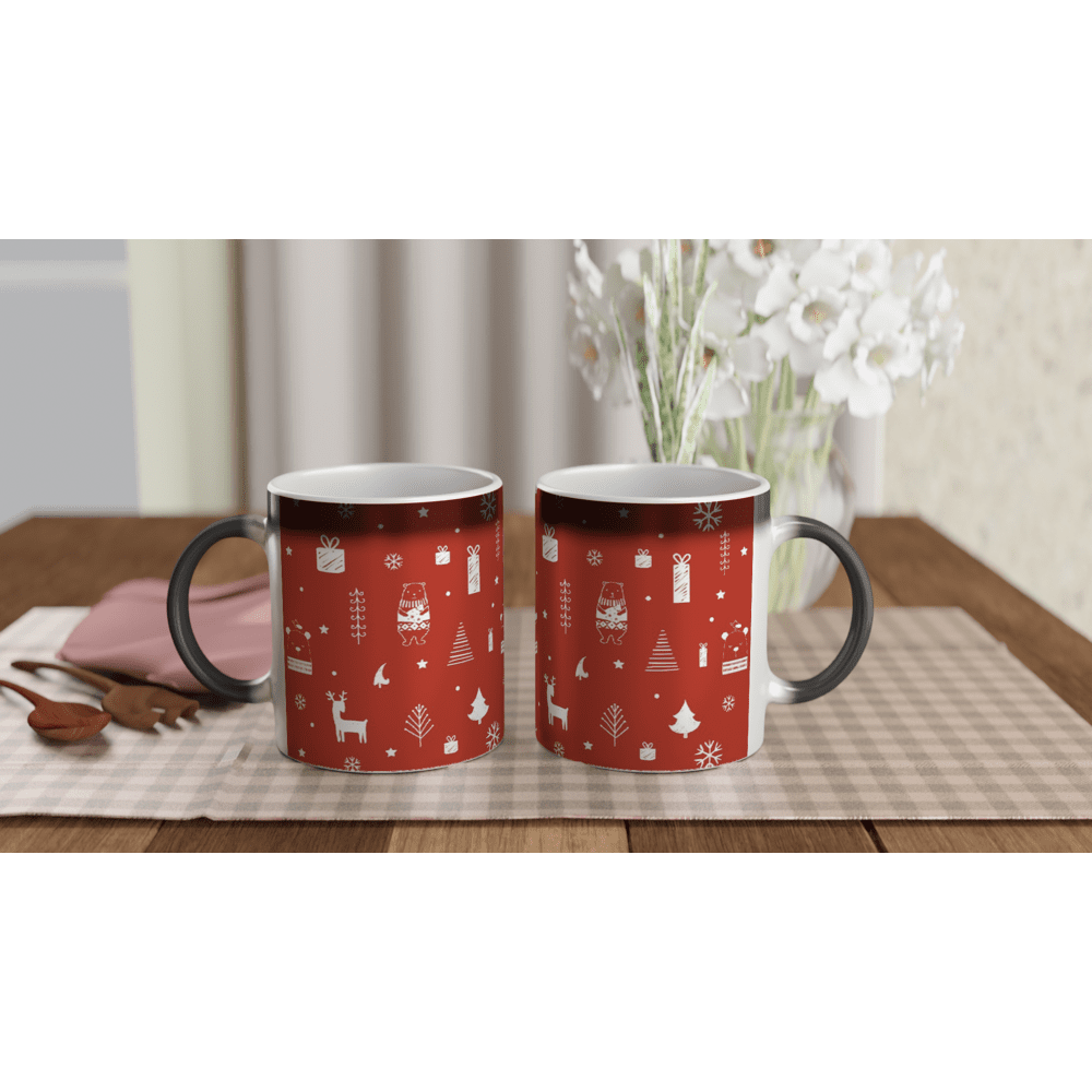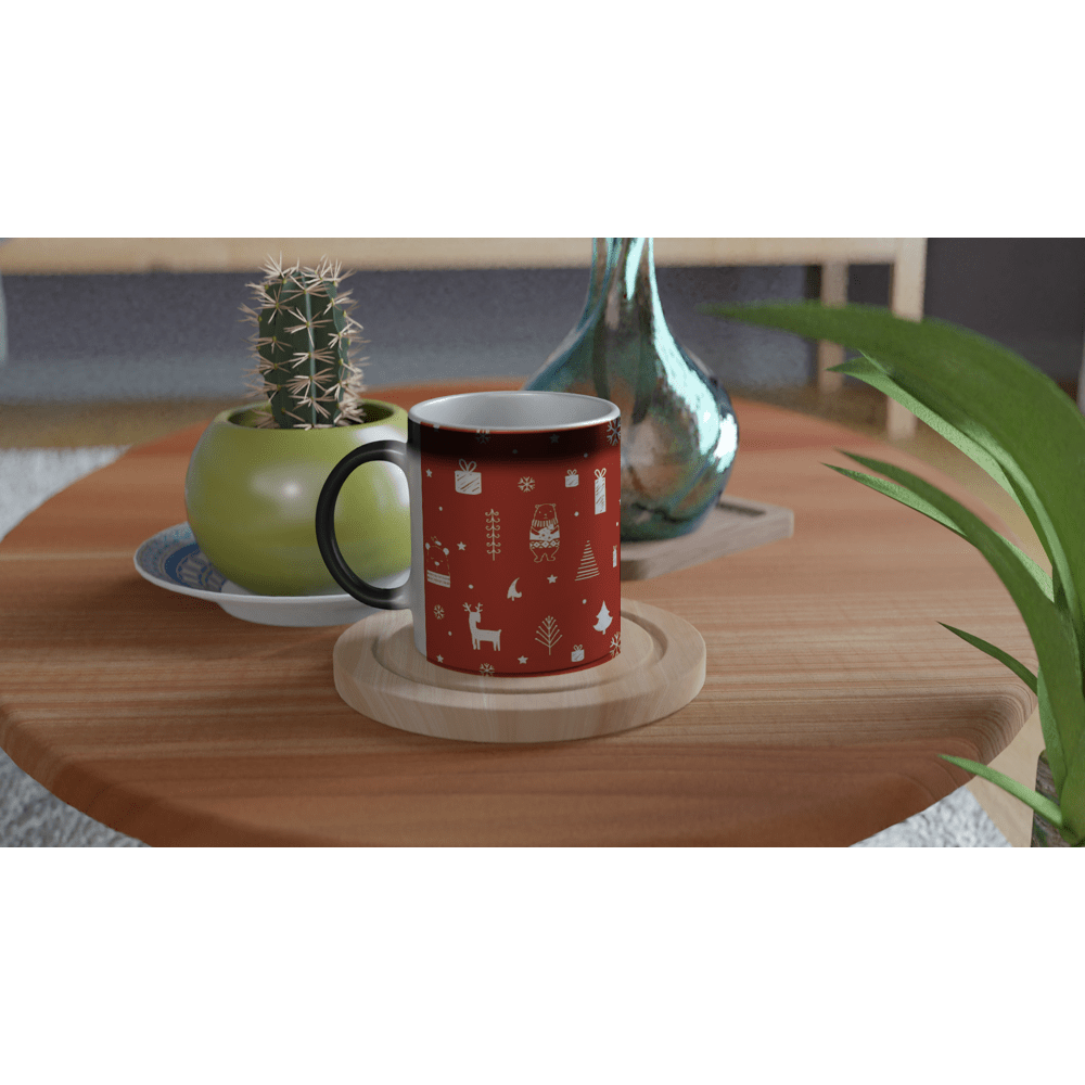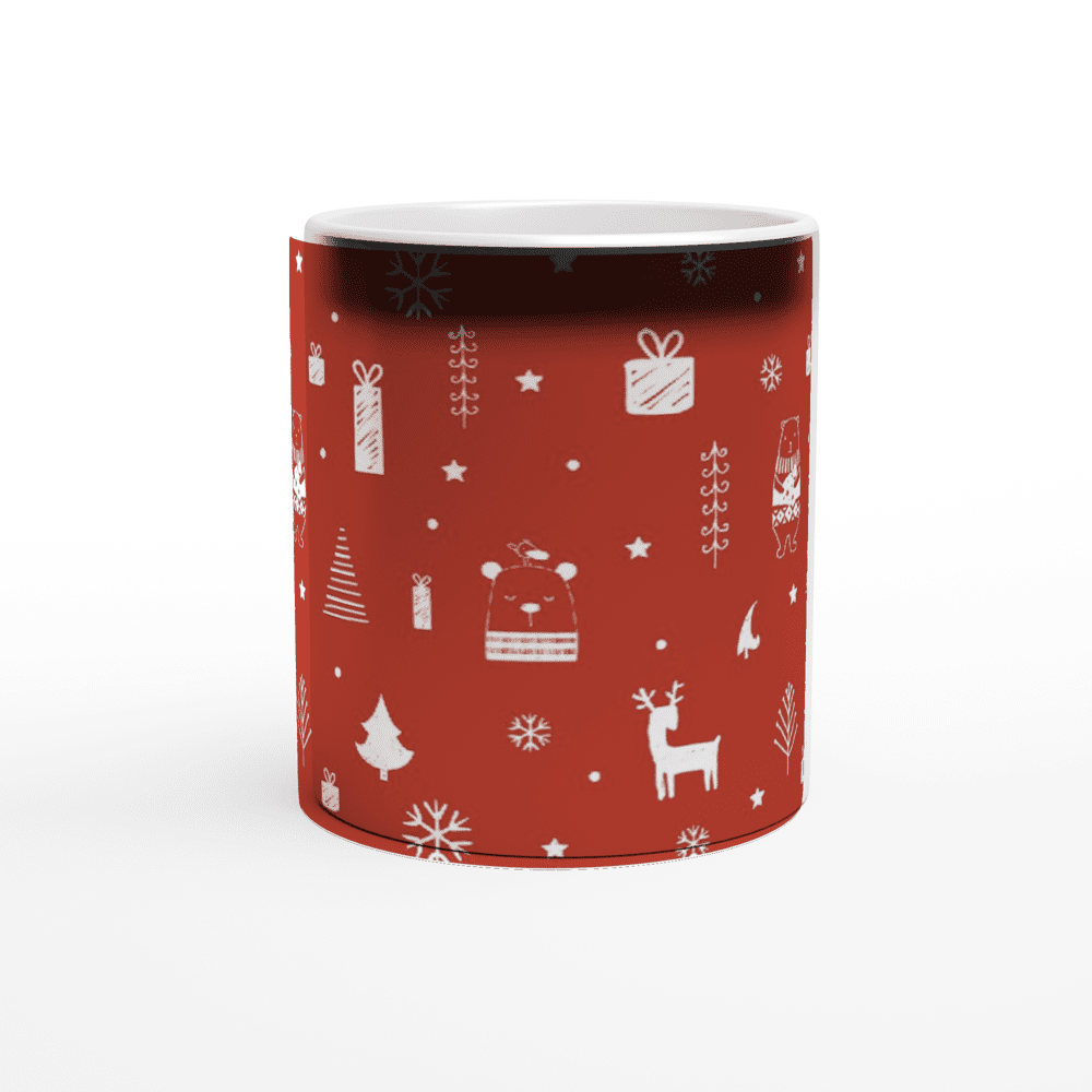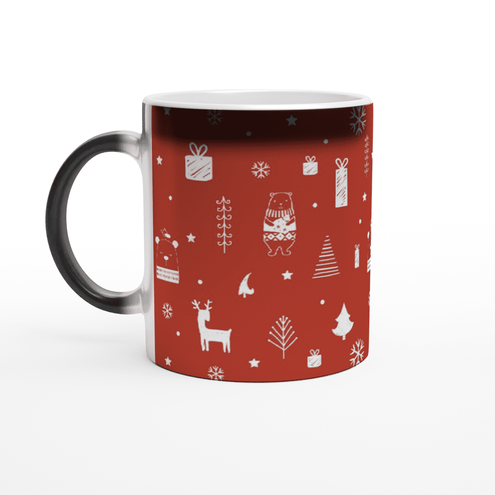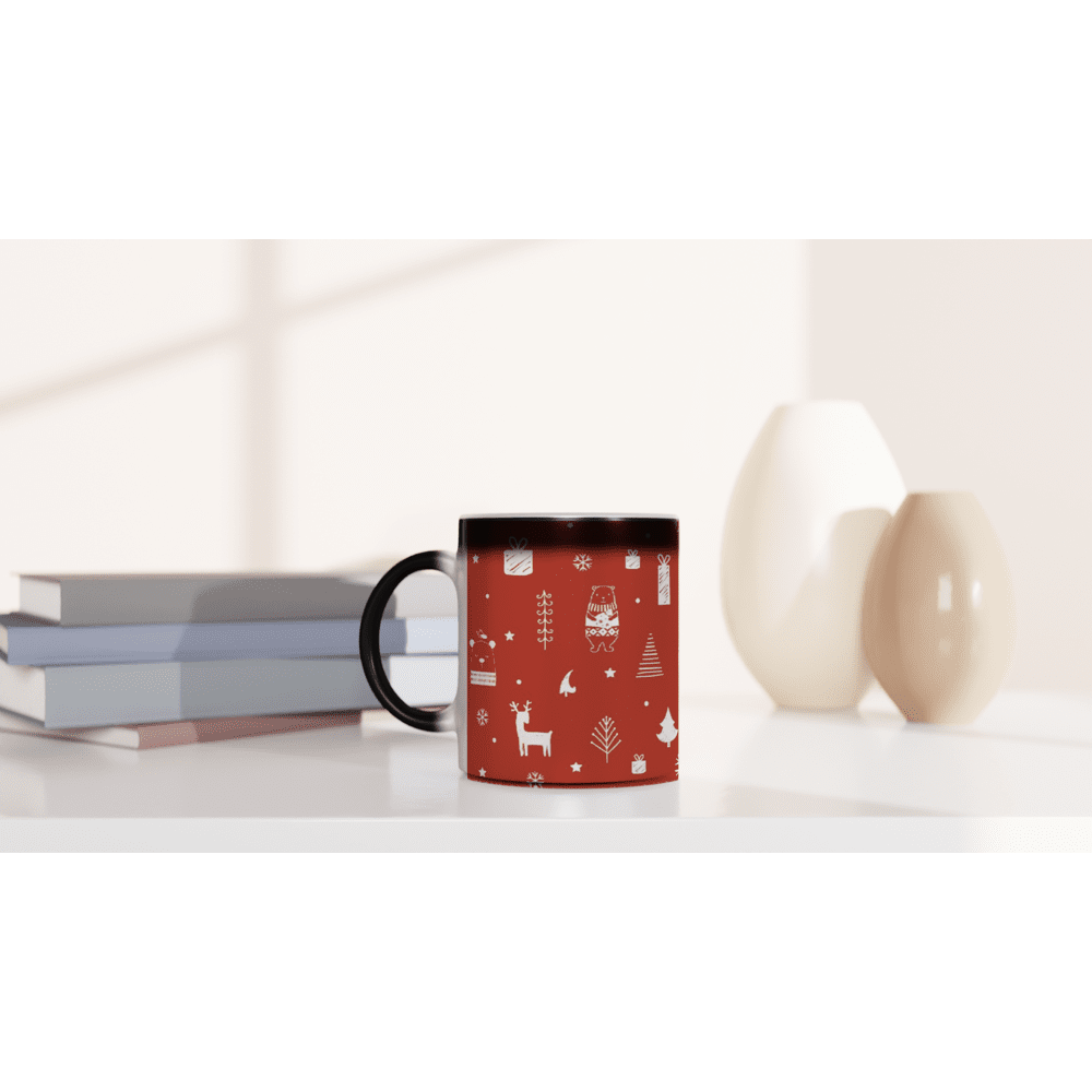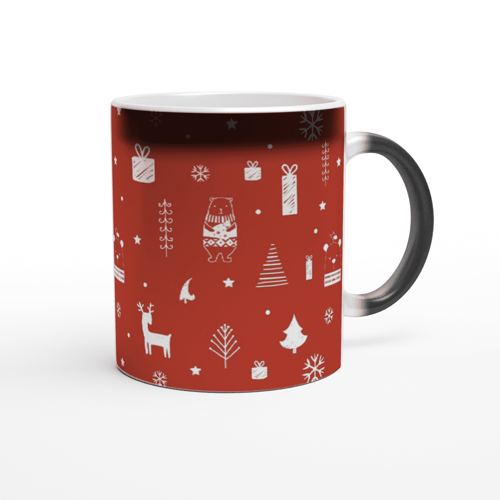 This mug has a black glossy finish when it’s empty. When a hot beverage is added, the mug reveals your beautiful artwork.
