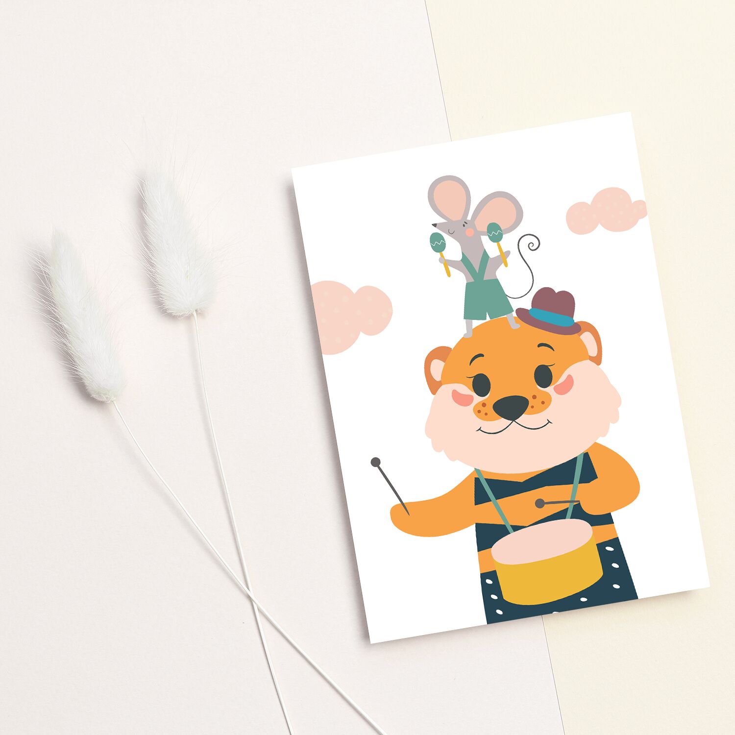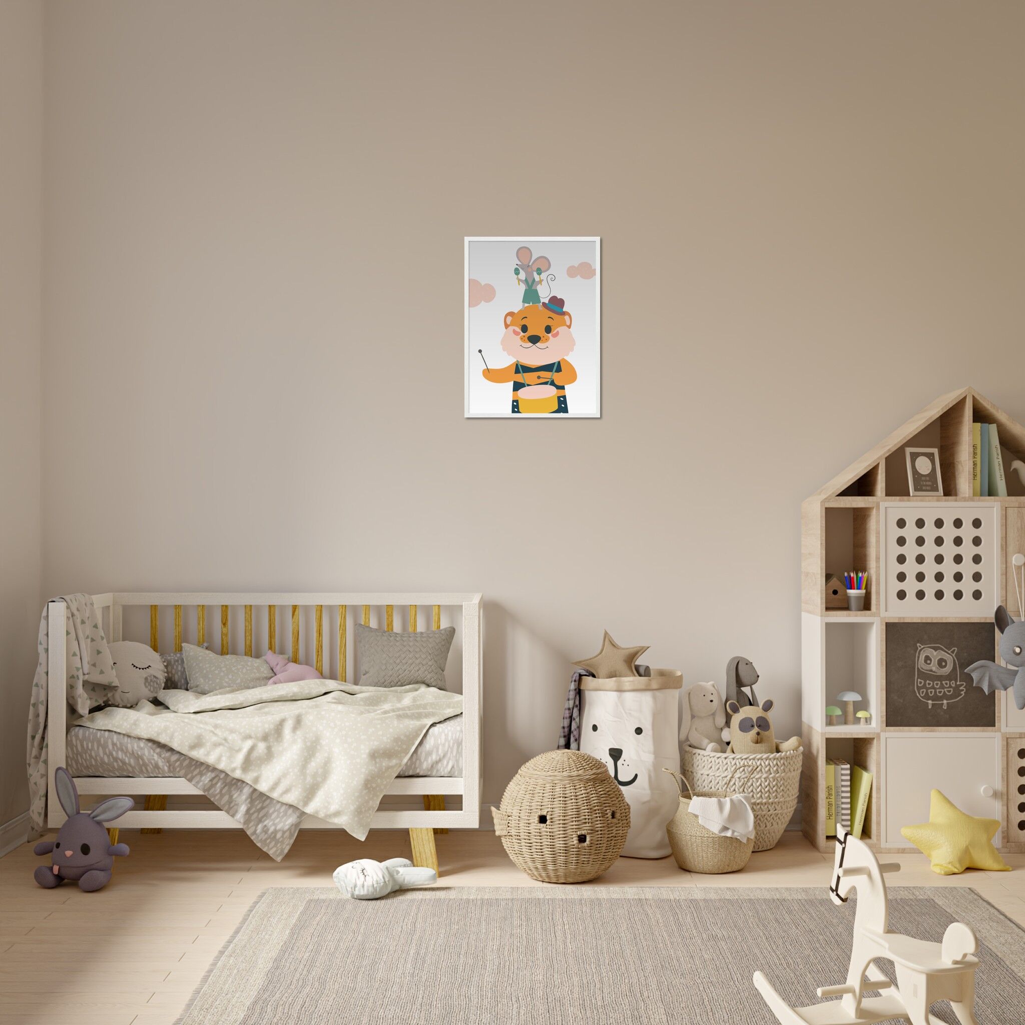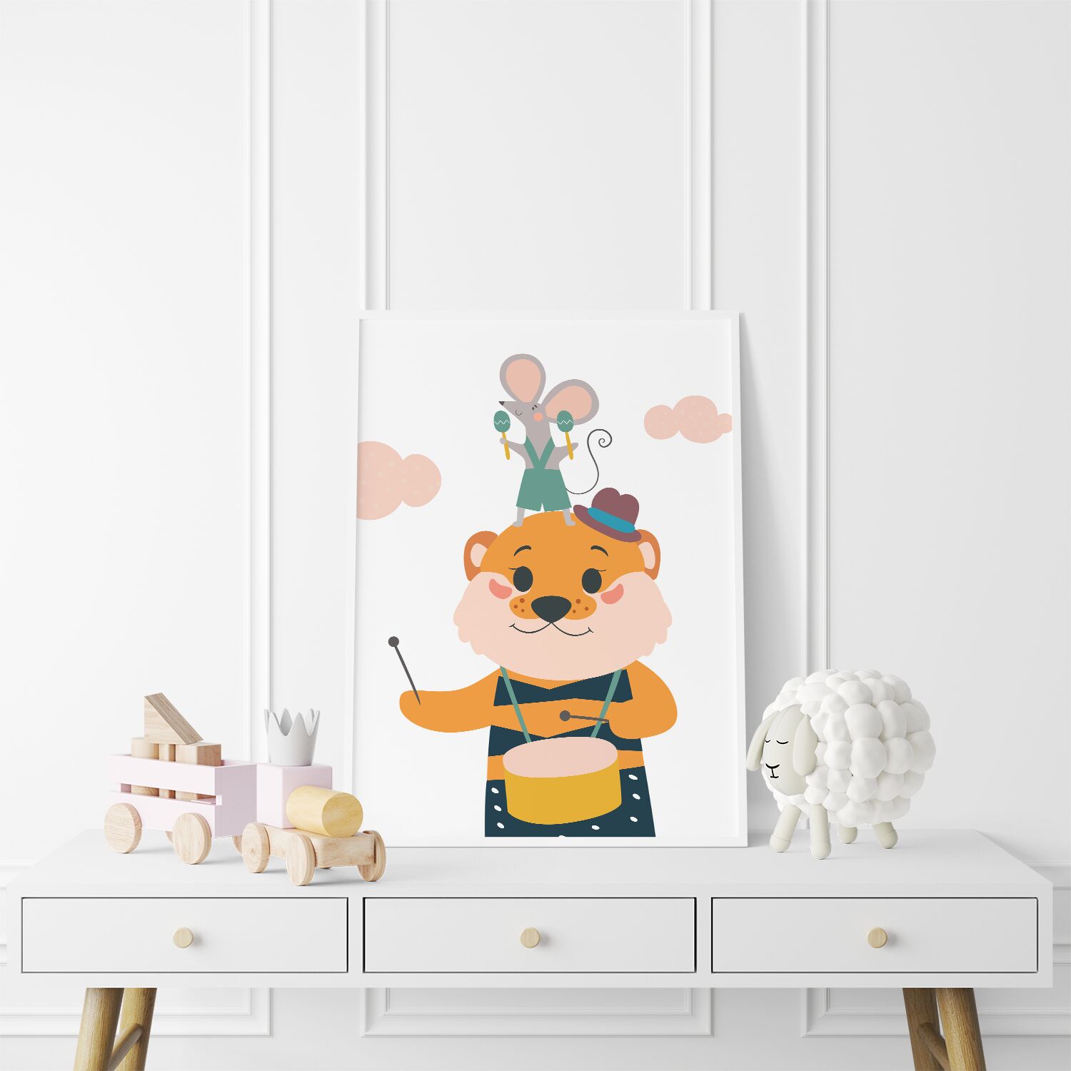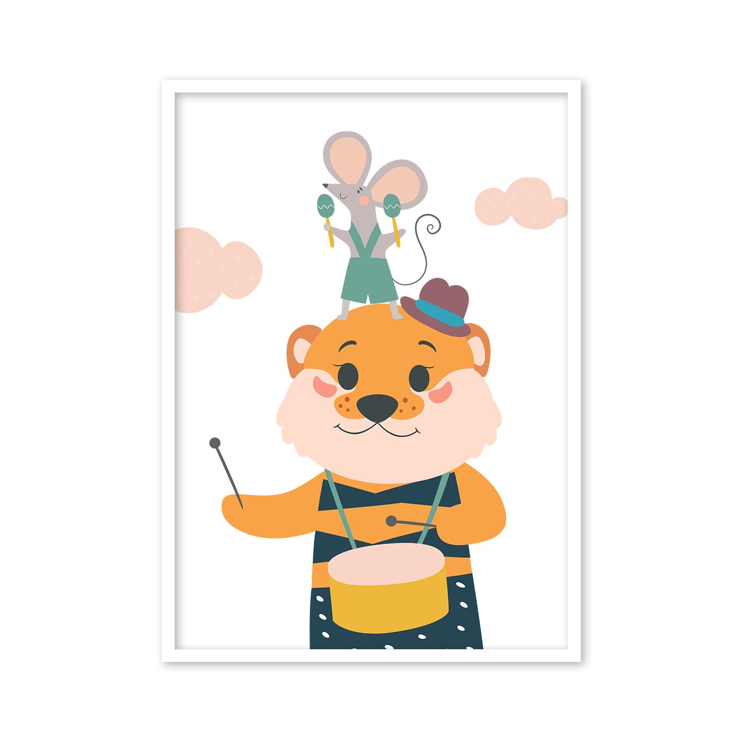 Looking for the ideal children’s day present to give to your little one? Or perhaps as a unique gift for your child’s birthday? Check out our latest Cute Tiger Playing a Side Drum and Rat on His Head Playing Maracas framed poster from our most recent collection of music posters. The deep colors of this painting will undoubtedly give your baby’s nursery a cozy and pleasant feel. This is offered in three sizes: 45 x 60, 50 x 70, and 70 x 100 cm and is made of rich matte paper with a thin wooden frame in black, white, or natural wood color. This thoughtful and memorable present can also be given to a beautiful mommy to be at her baby shower.
