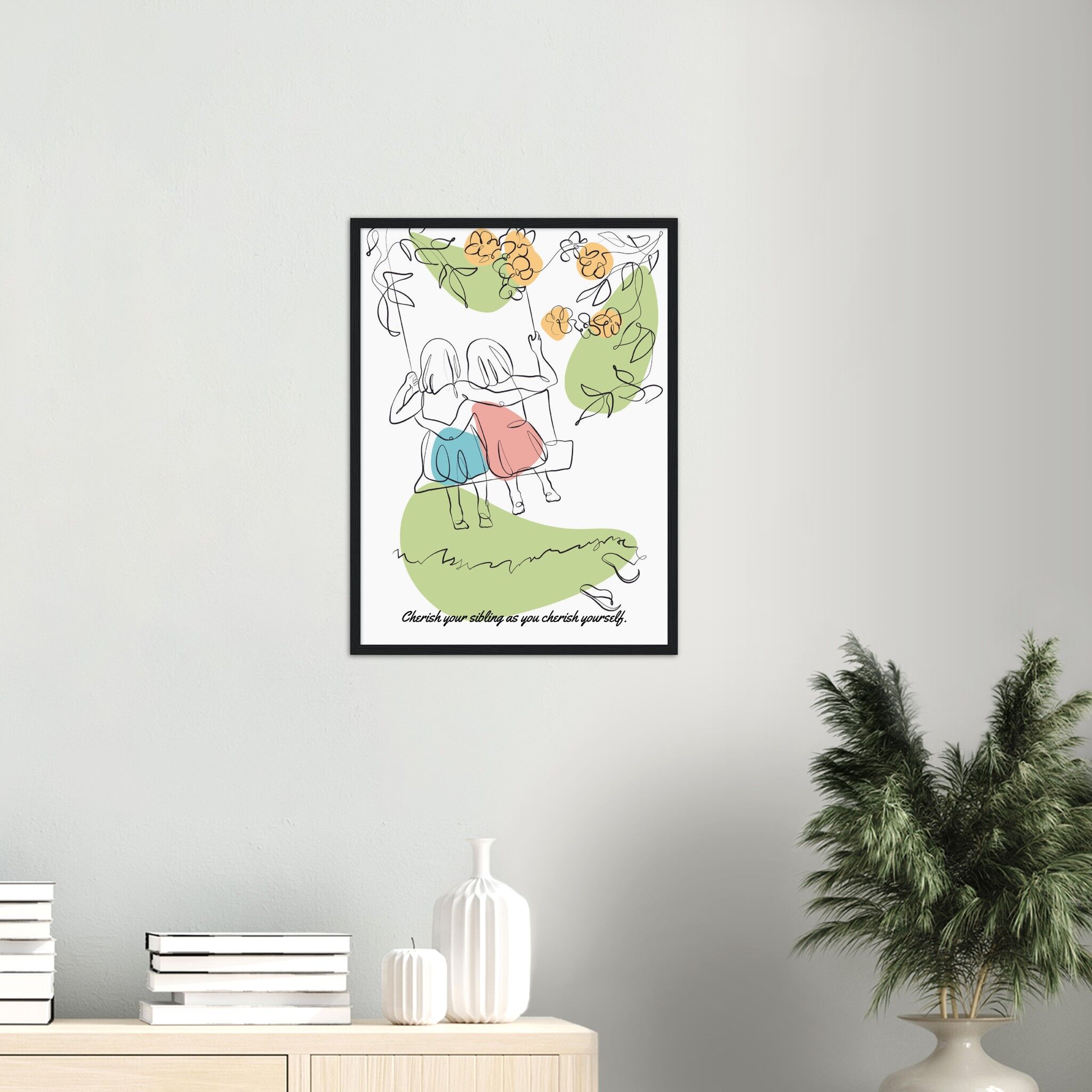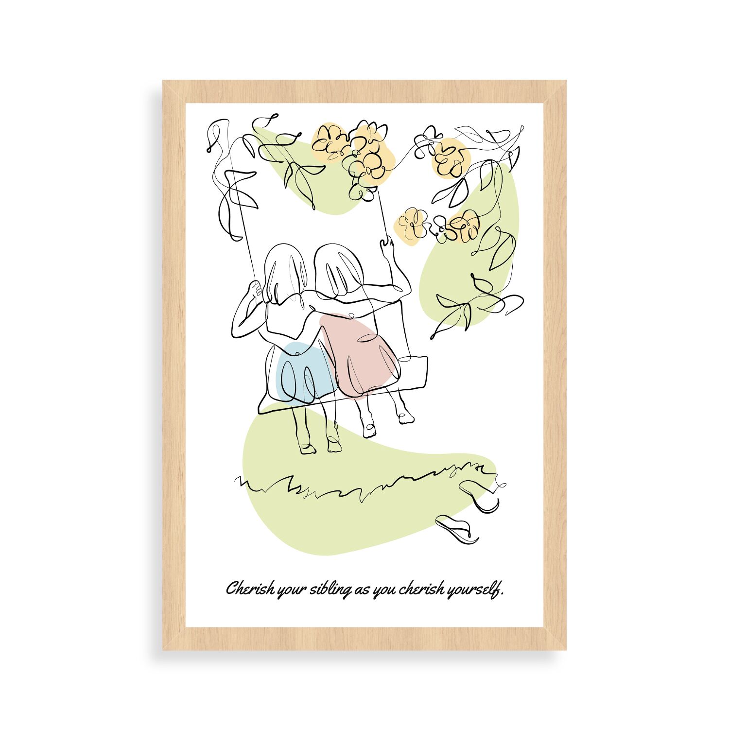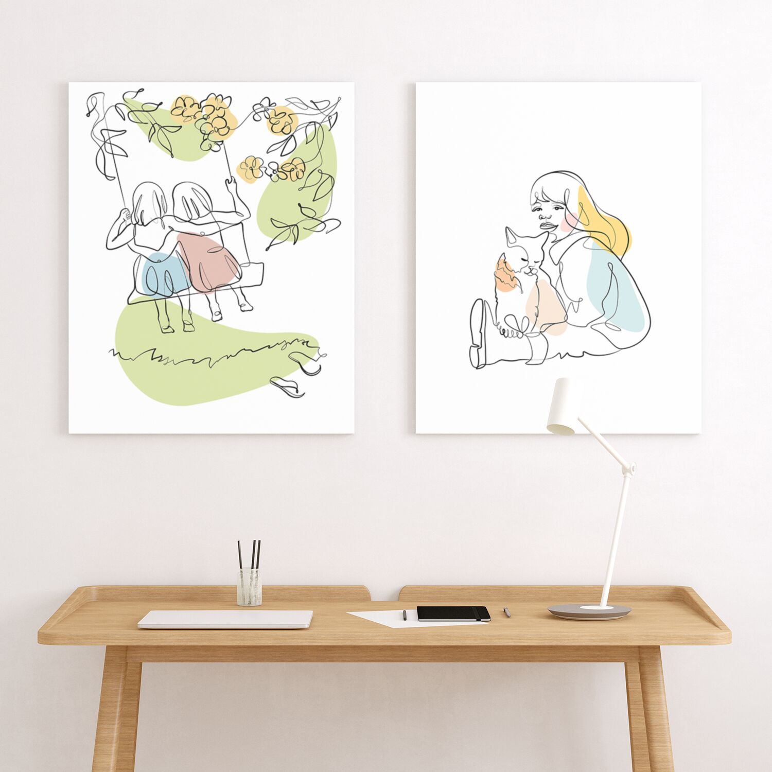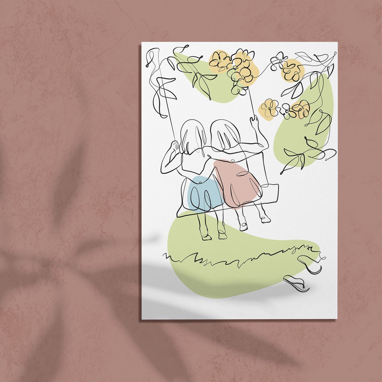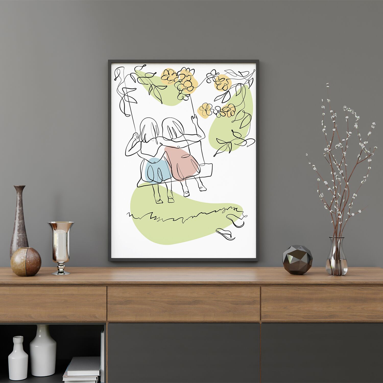 This line art is sure to be a favorite for every home from nurseries and playrooms, to bedrooms and adult rooms. Perfect for adding a splash of color to any wall this two little sisters are swinging away on the swing!
