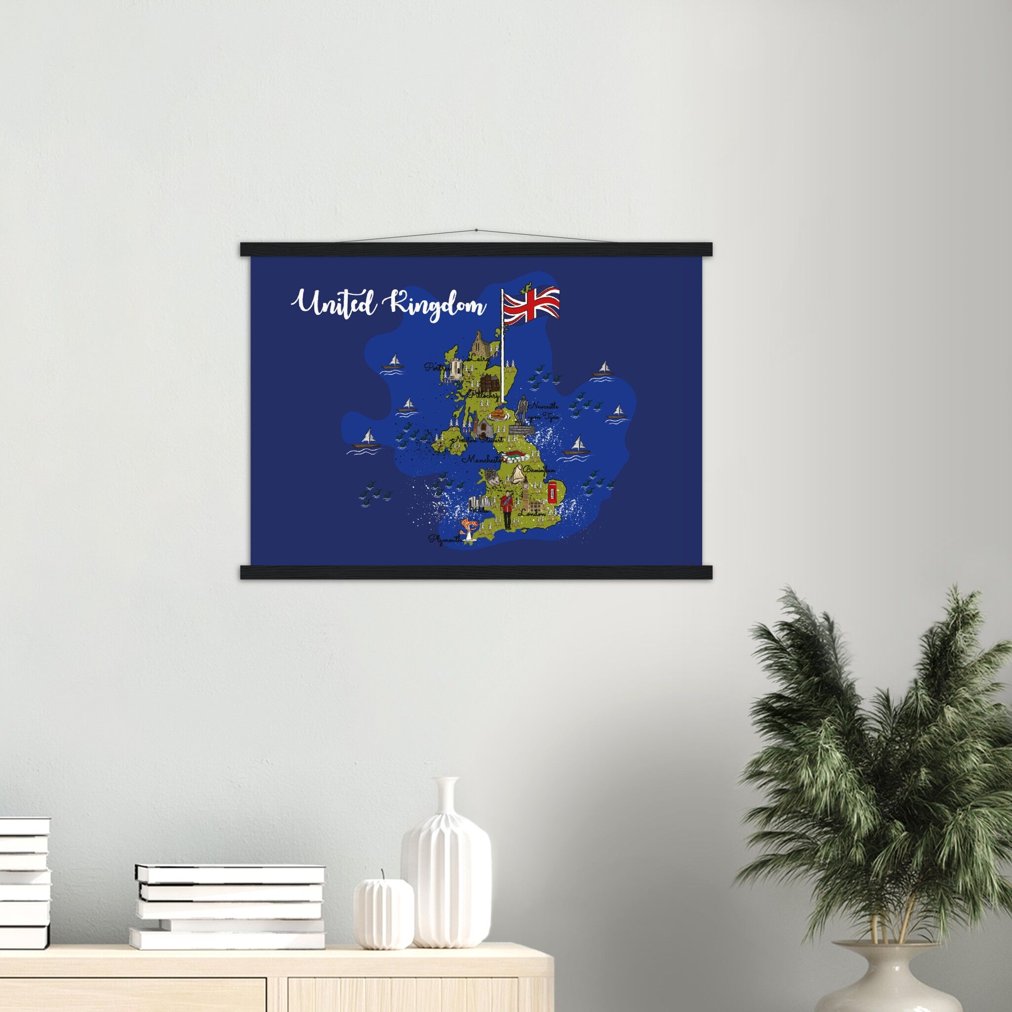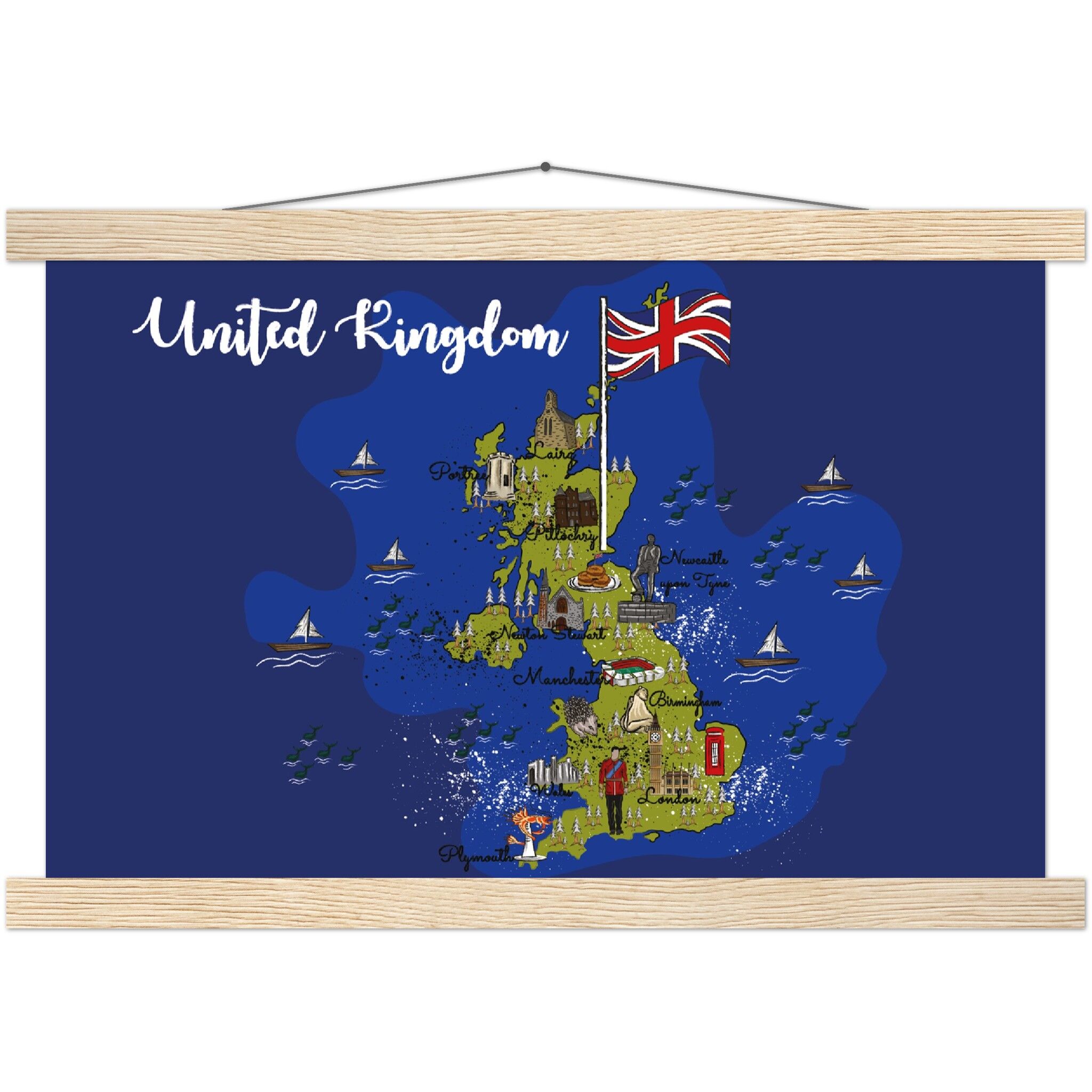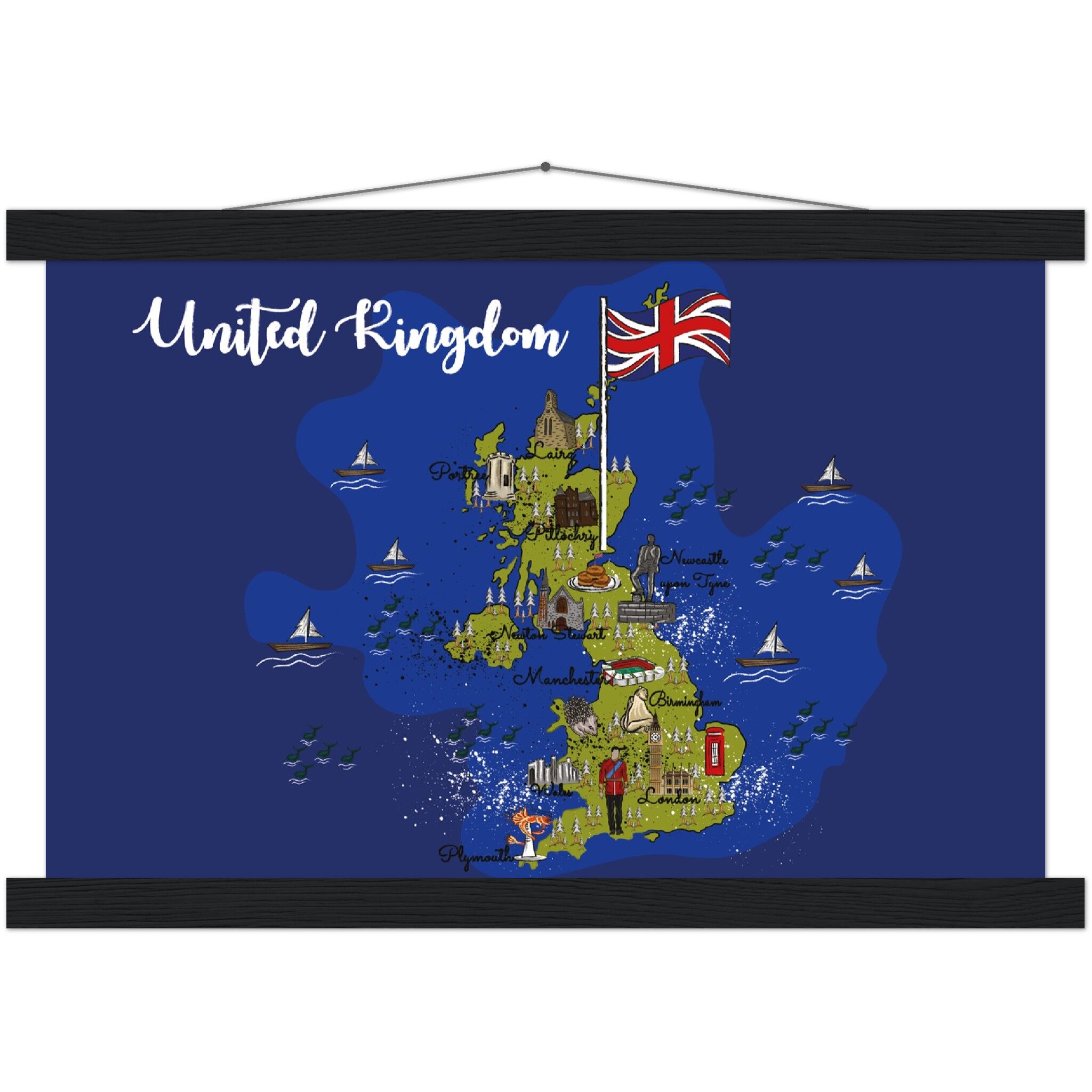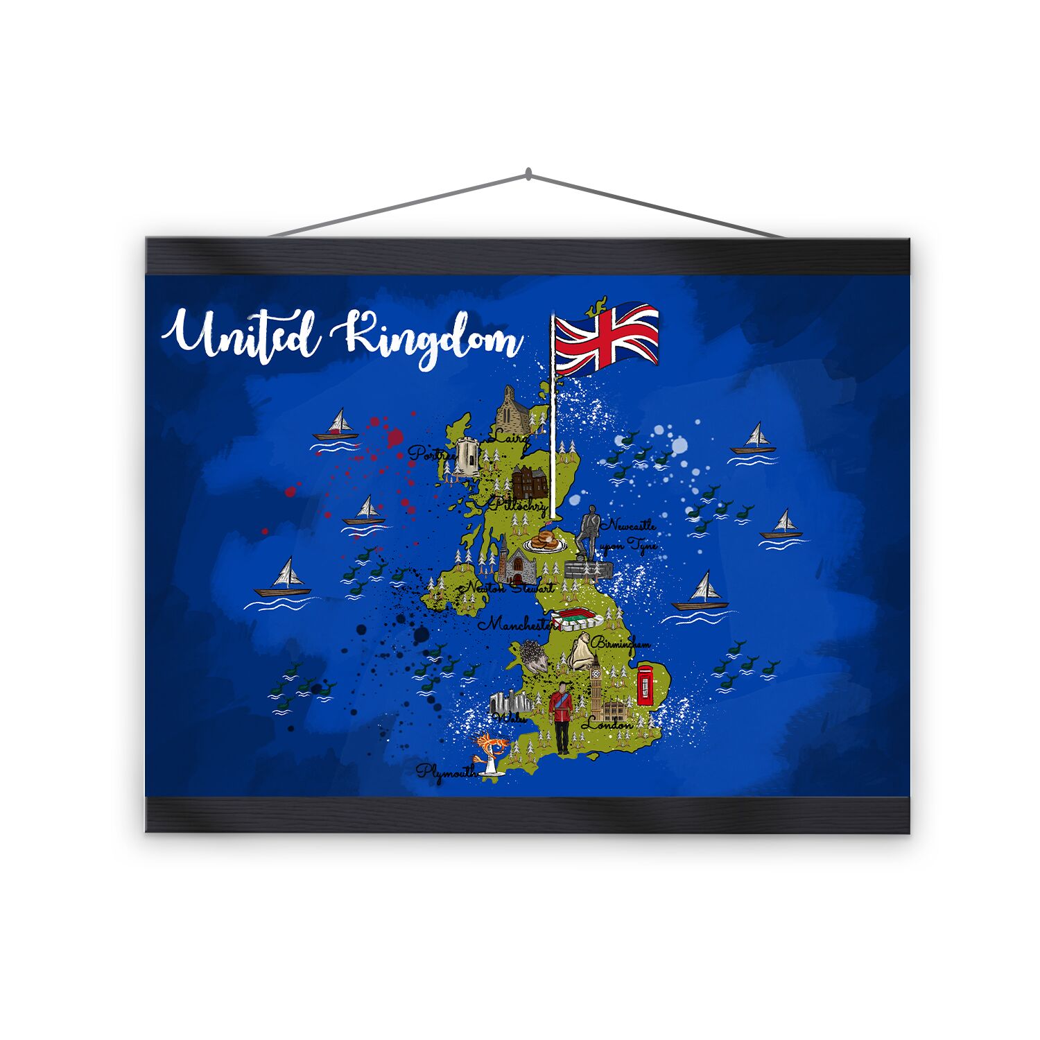 A high-quality poster and a beautiful hanger. Each hanger includes four wooden sticks, two that clamp the top of your print and two that clamp the bottom, and cotton ropes that match the hanger color. Strong magnets securely grip your artwork, while easily allowing the customer to change the art whenever is needed.