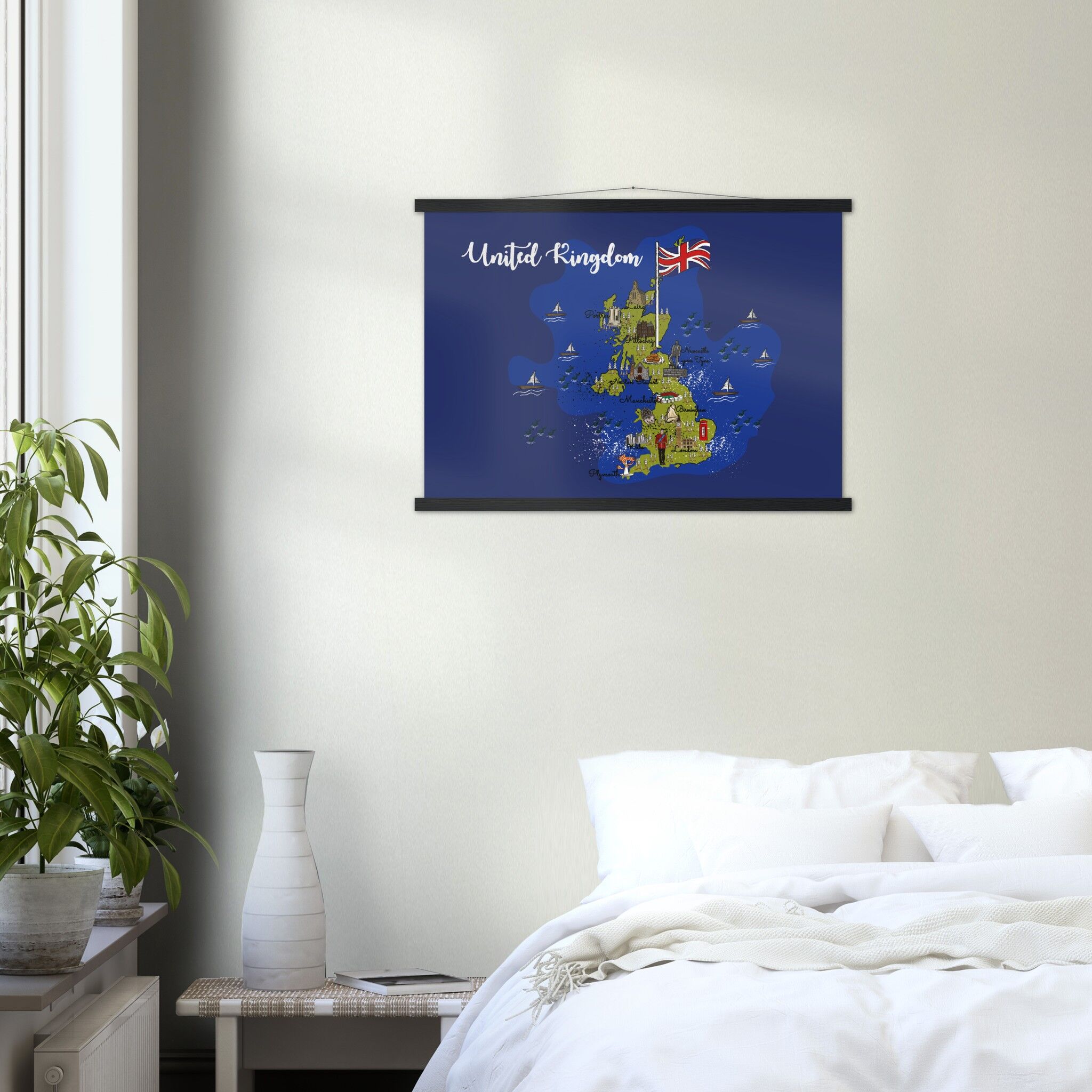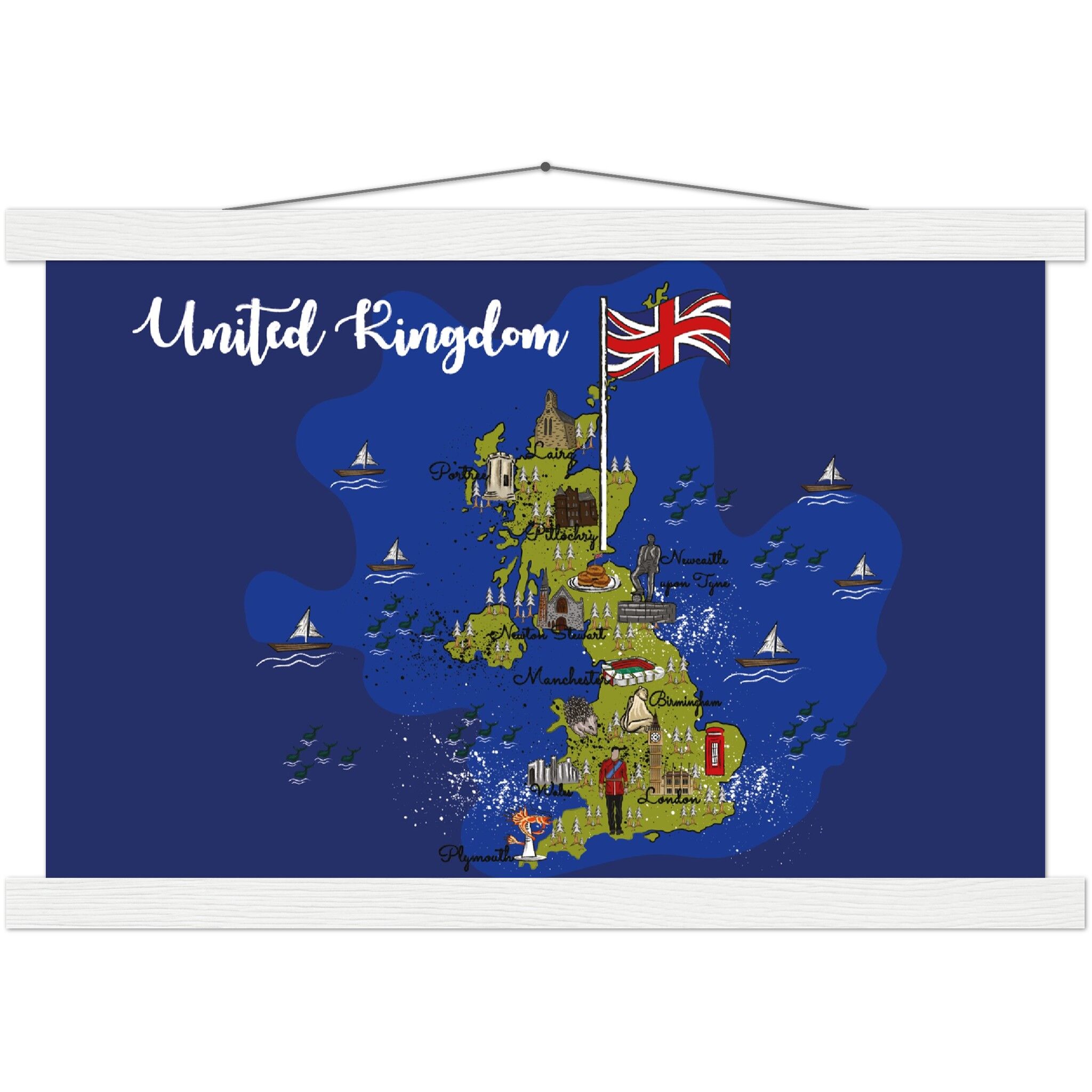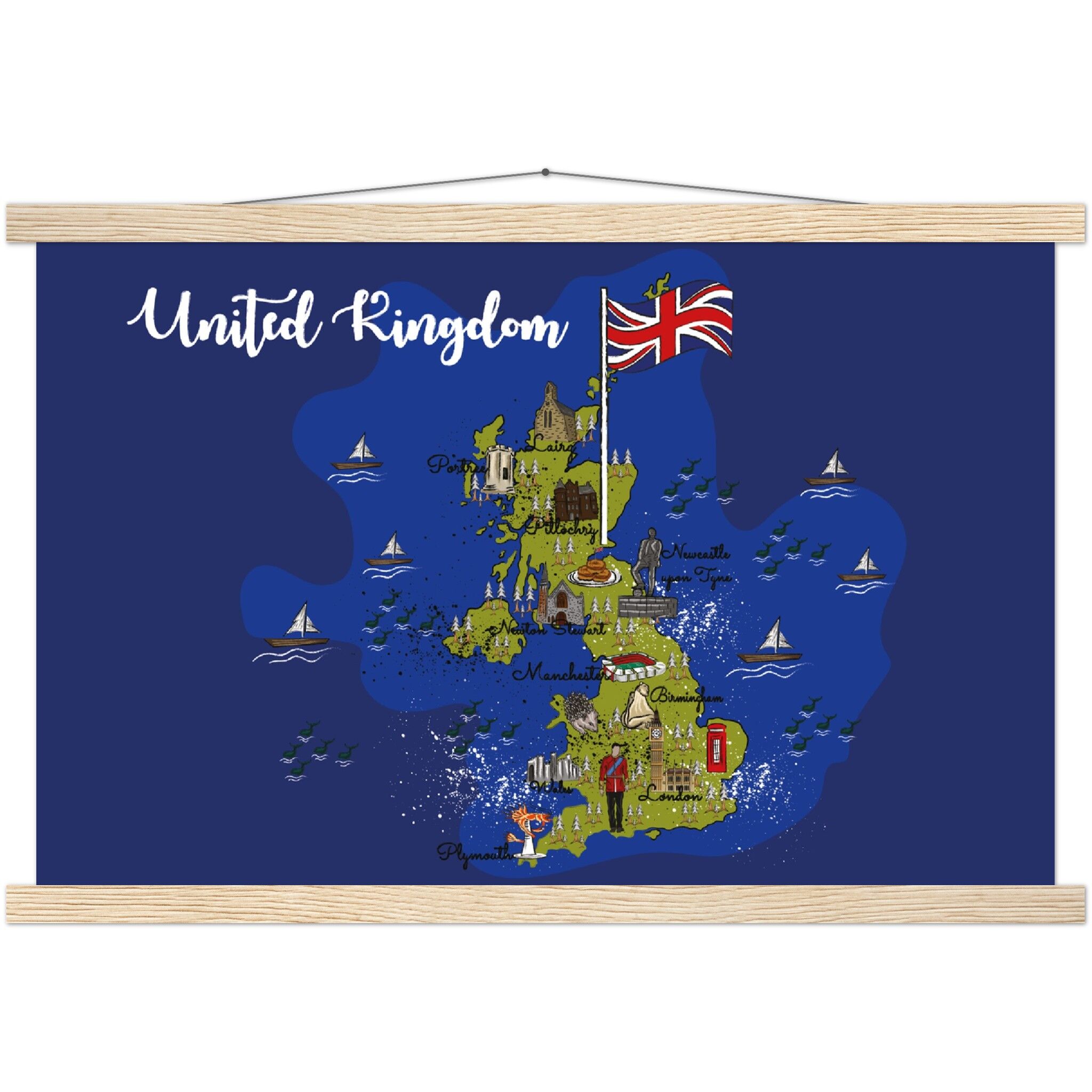 A high-quality poster and a beautiful hanger. Each hanger includes four wooden sticks, two that clamp the top of your print and two that clamp the bottom, and cotton ropes that match the hanger color. Strong magnets securely grip your artwork, while easily allowing the customer to change the art whenever is needed.