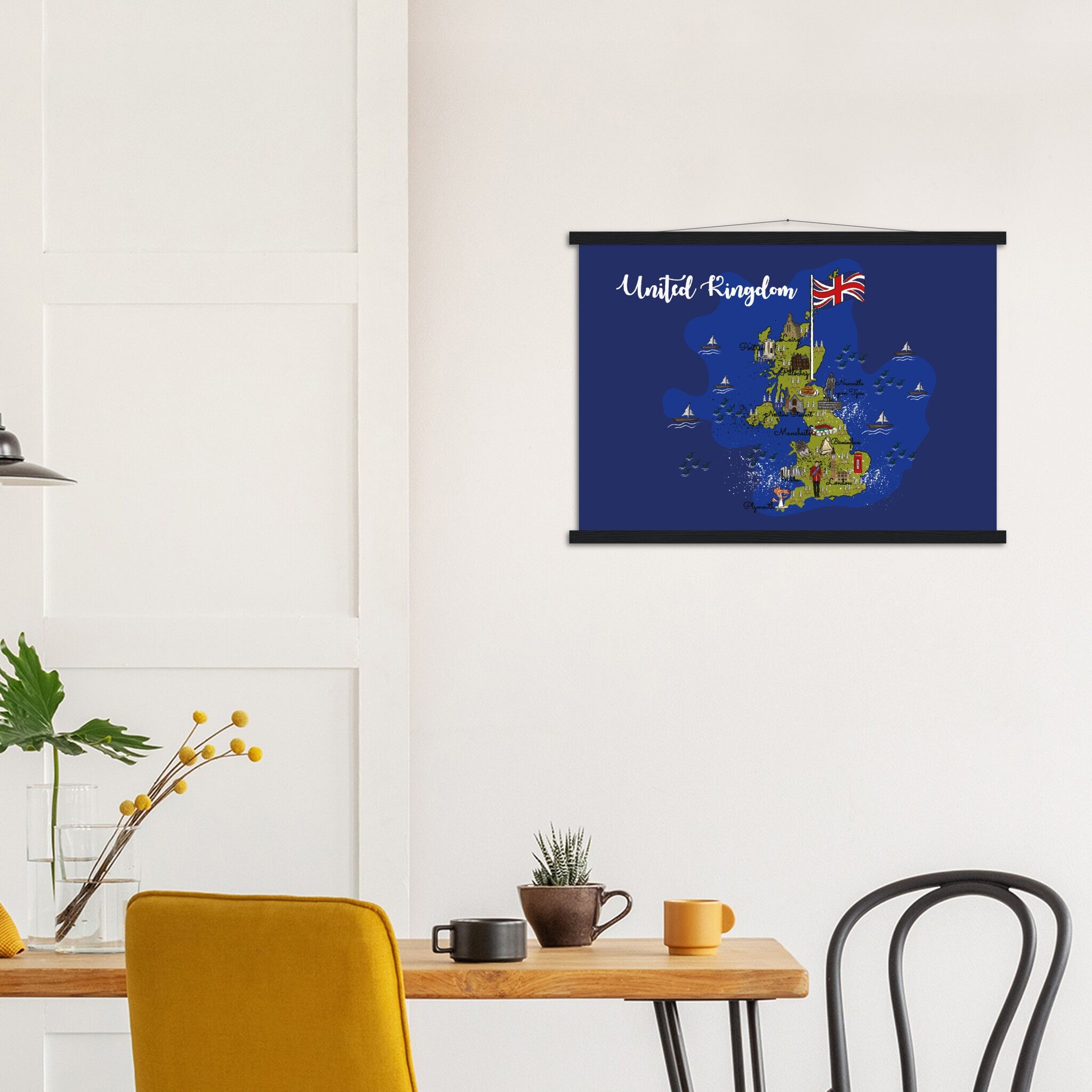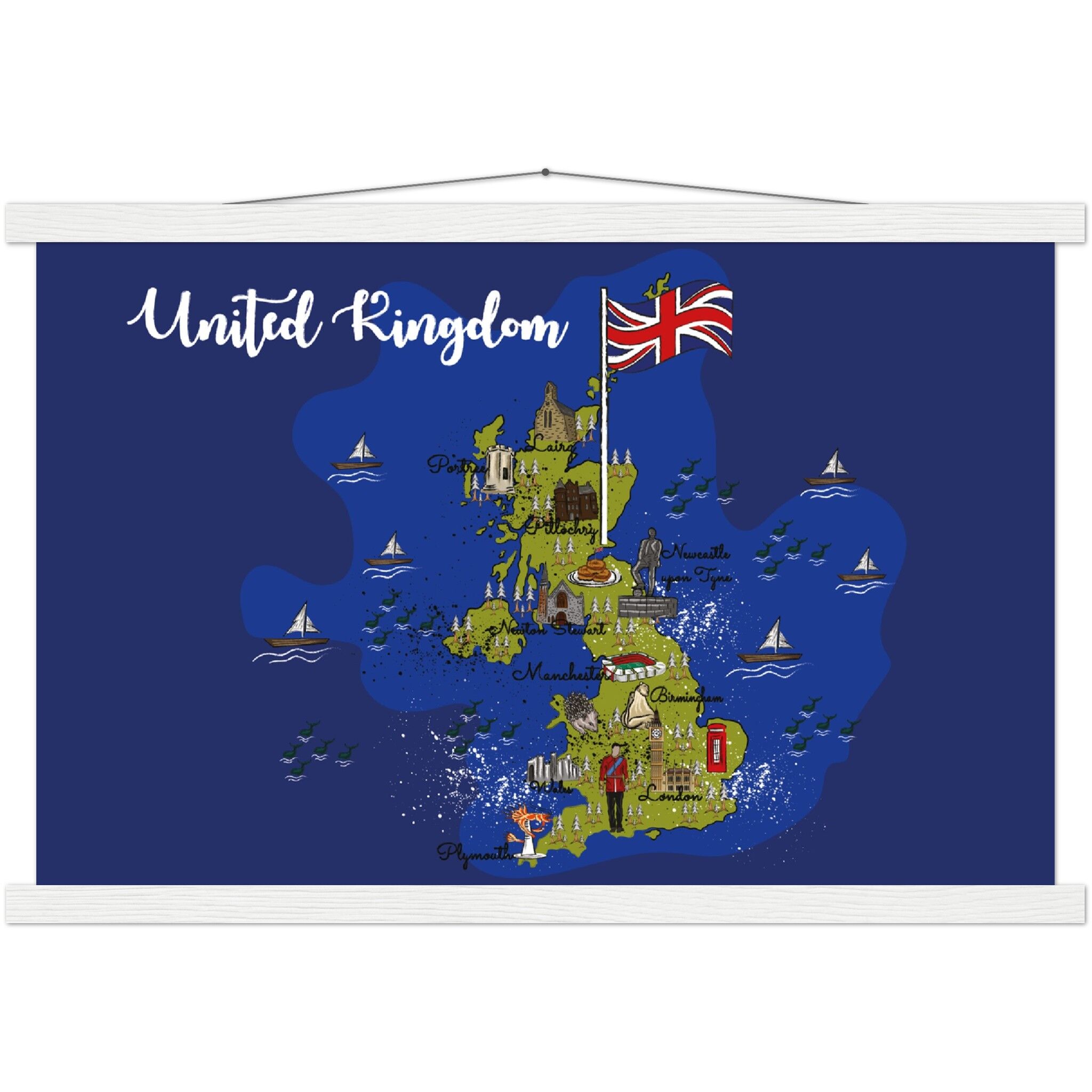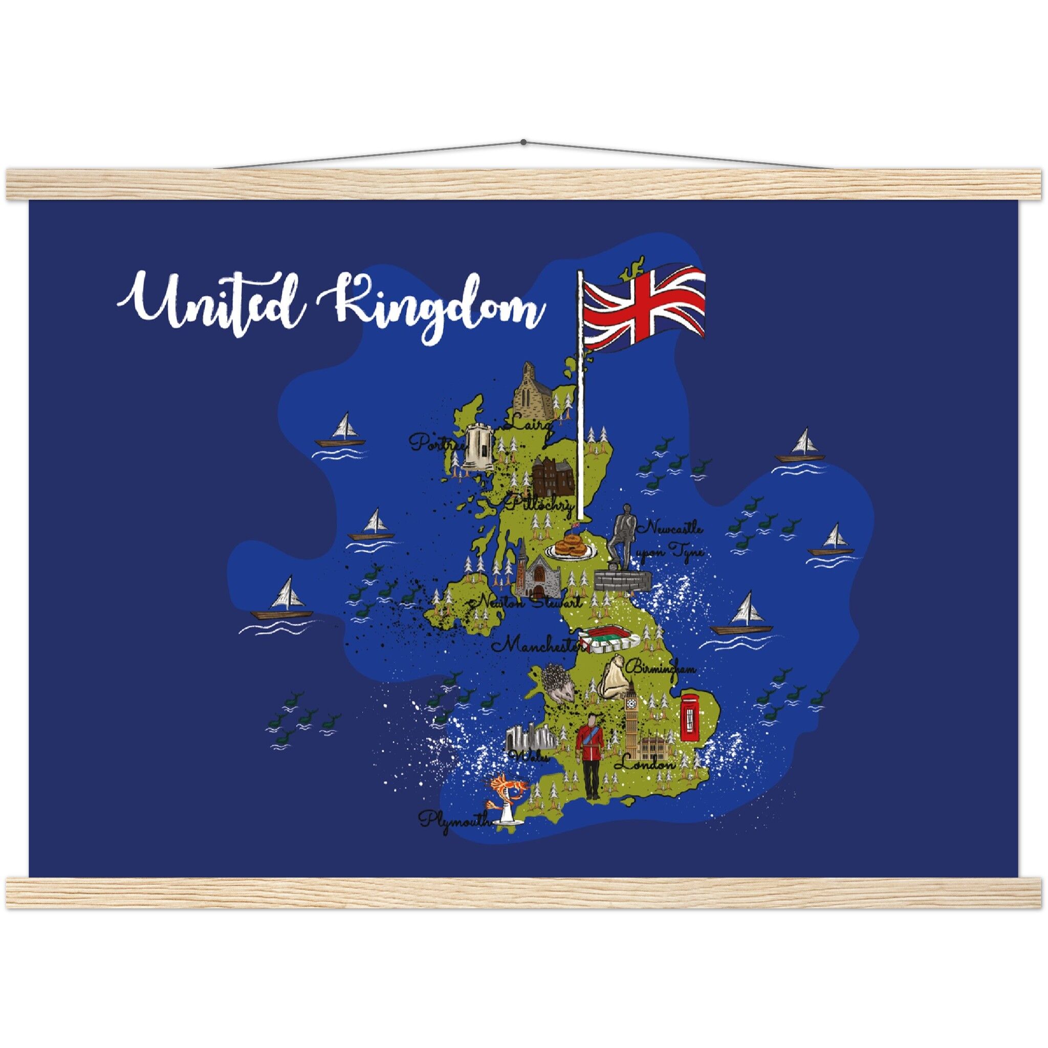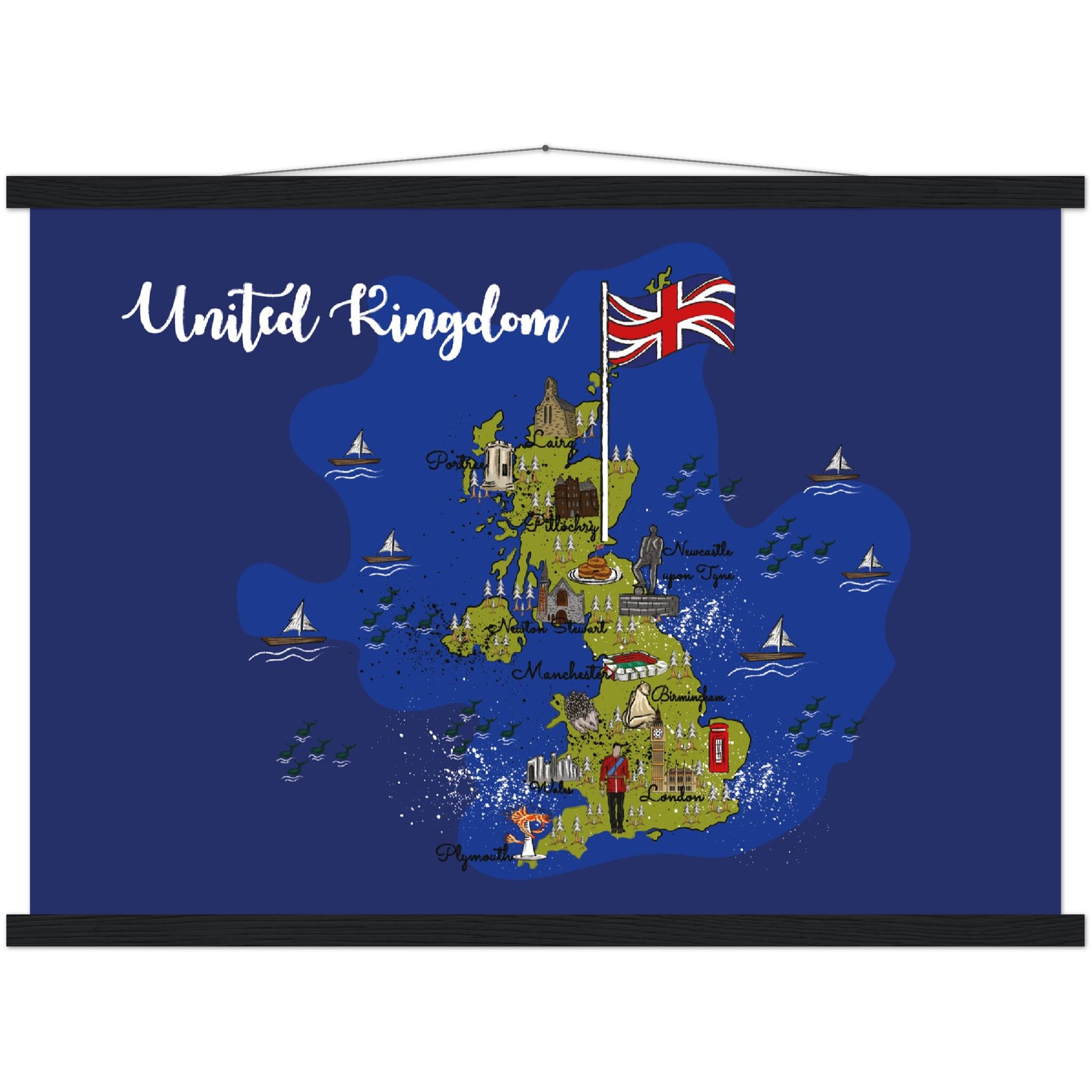 A high-quality poster and a beautiful hanger. Each hanger includes four wooden sticks, two that clamp the top of your print and two that clamp the bottom, and cotton ropes that match the hanger color. Strong magnets securely grip your artwork, while easily allowing the customer to change the art whenever is needed.